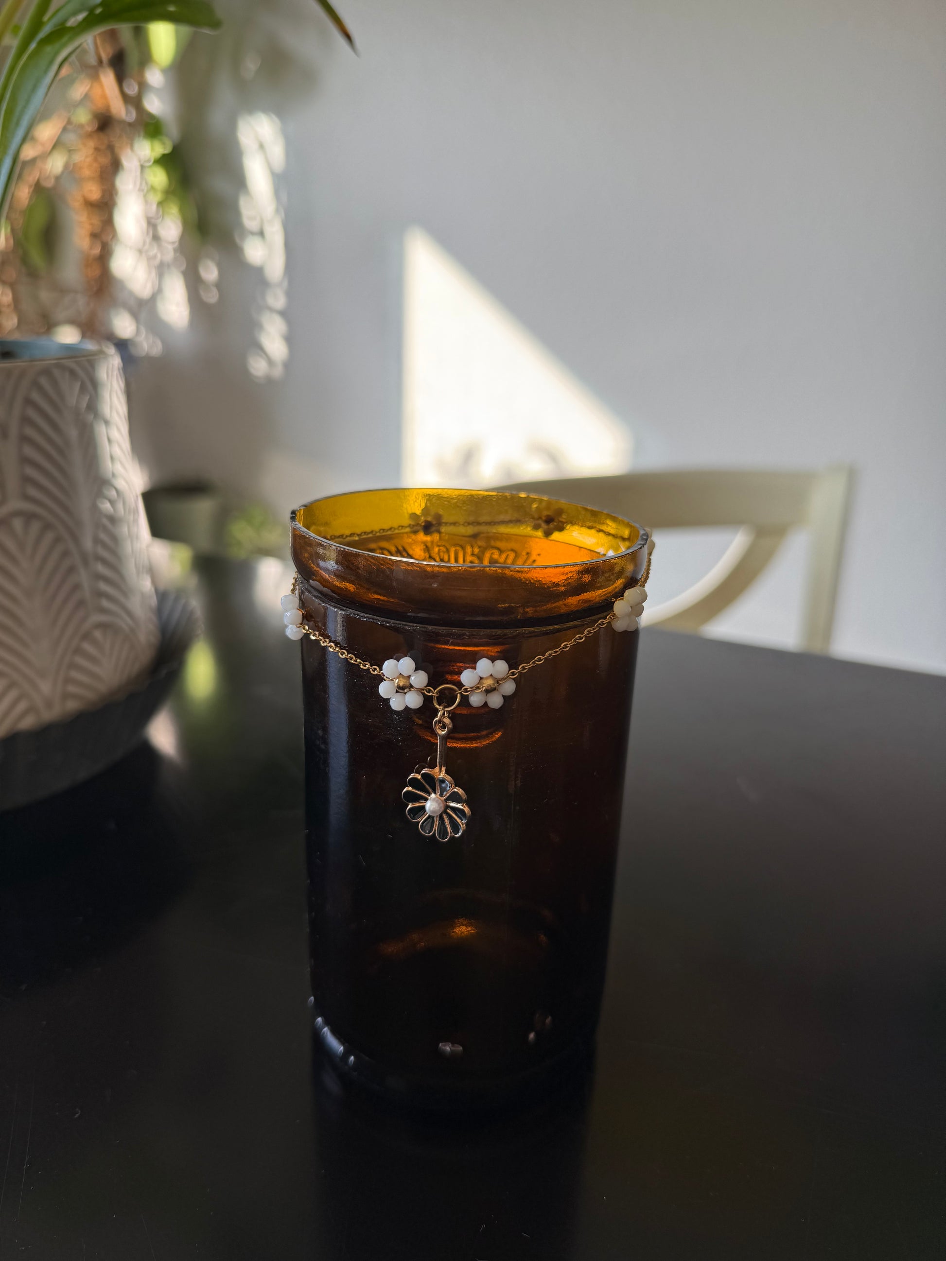 Adding a touch of elegance, this vase features a delicate gold chain charm, adorned with white flowers and a green and gold daisy charm for a fresh, botanical aesthetic. Perfect for displaying on shelves, desks, or windowsills, this unique piece brings a blend of eco-friendly craftsmanship and natural beauty to your plant collection.