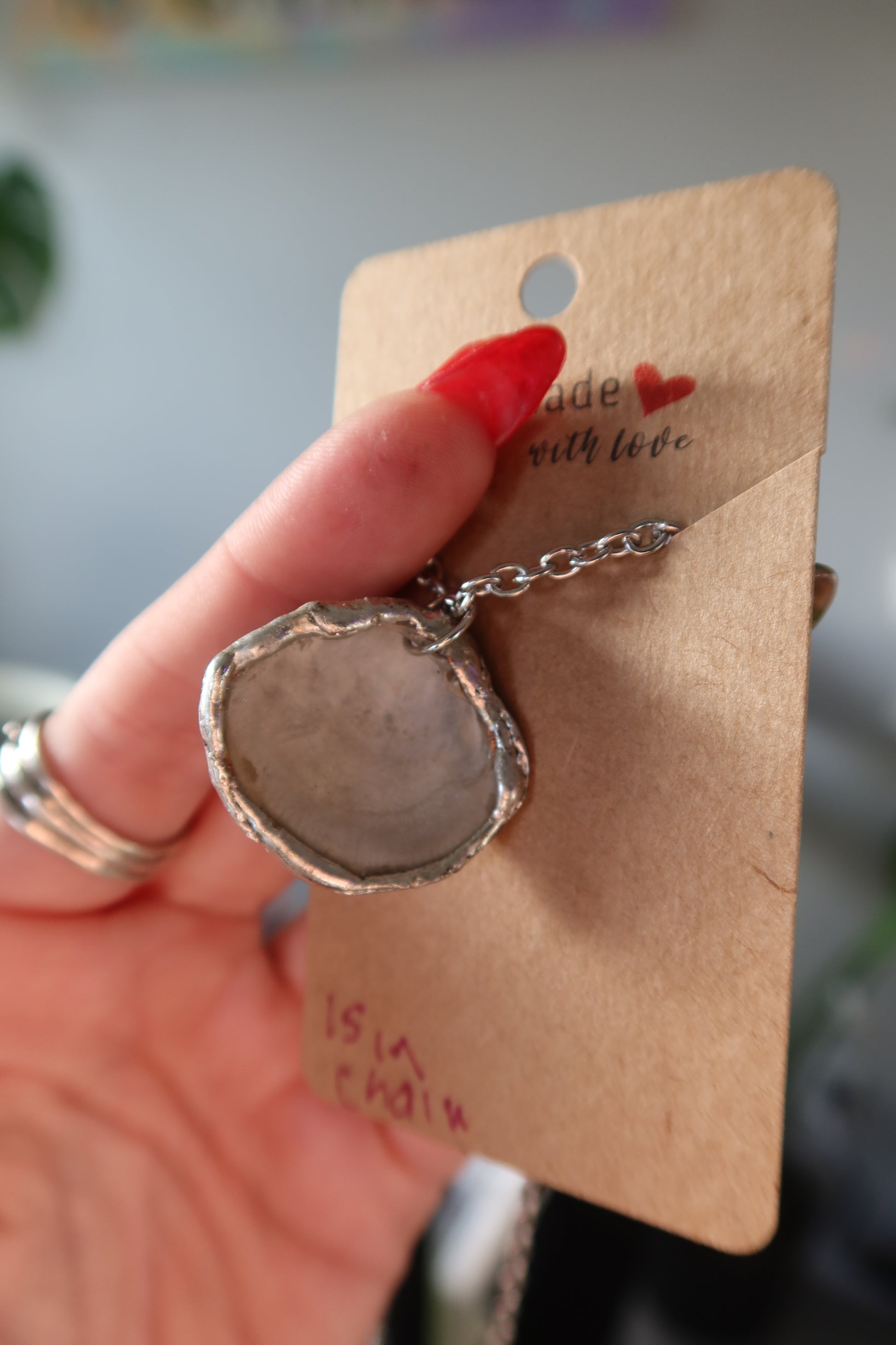 Dive into dark oceanic elegance with this handcrafted cone shell necklace. The natural shell is framed by a jagged, lead-free tin soldered edge, giving it an edgy, sea-worn look reminiscent of a mermaid’s hidden treasures. Hanging on an 15-inch stainless steel chain, this piece embodies the perfect blend of gothic mystery and coastal charm. A must-have for those who love unique, otherworldly jewelry.