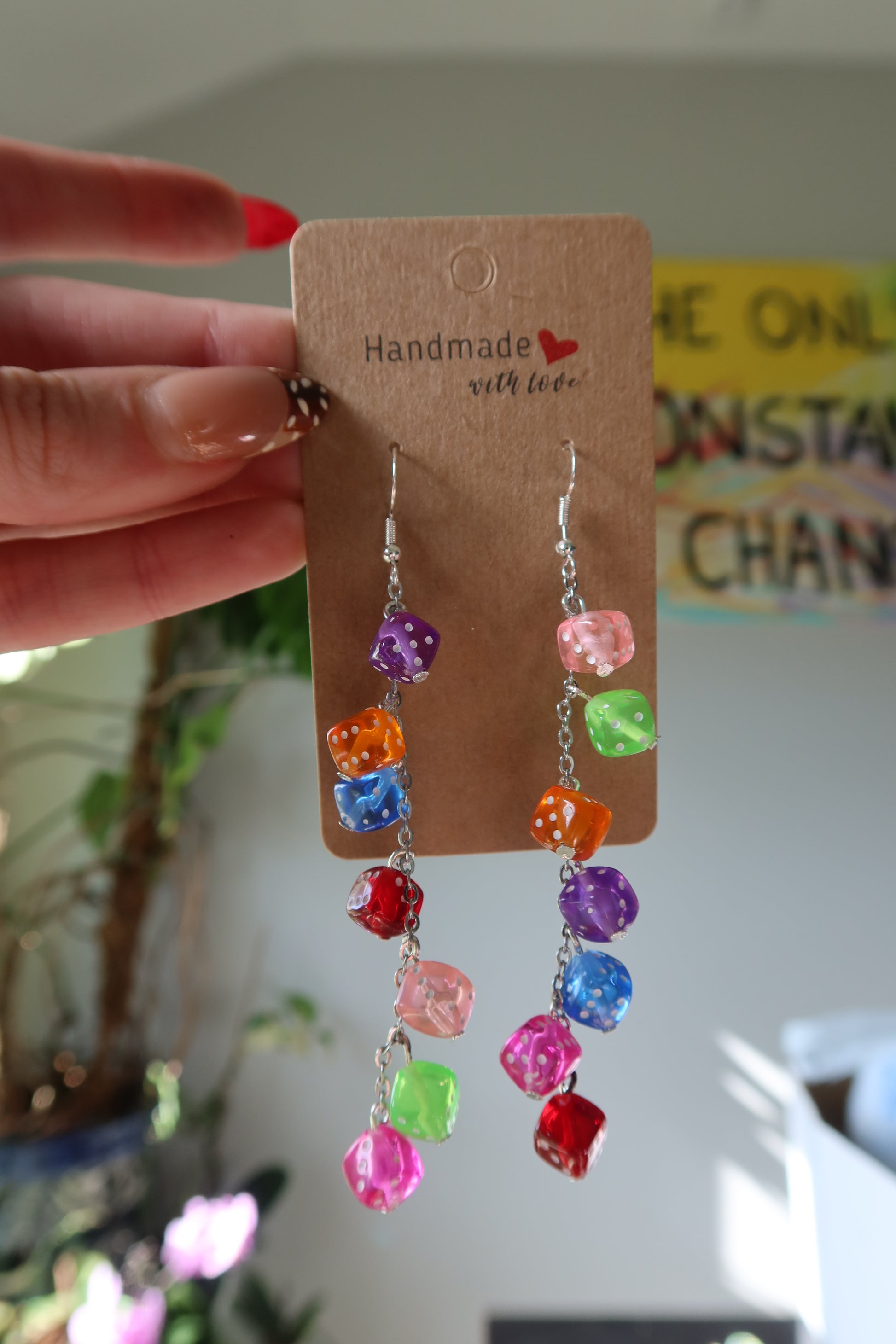 All eyes will roll (with envy) when you rock these Double Rainbow Dice Drop Earrings. Stacked with a cascade of multicolor dice on each side, these shoulder-grazing beauties are a maximalist dream.