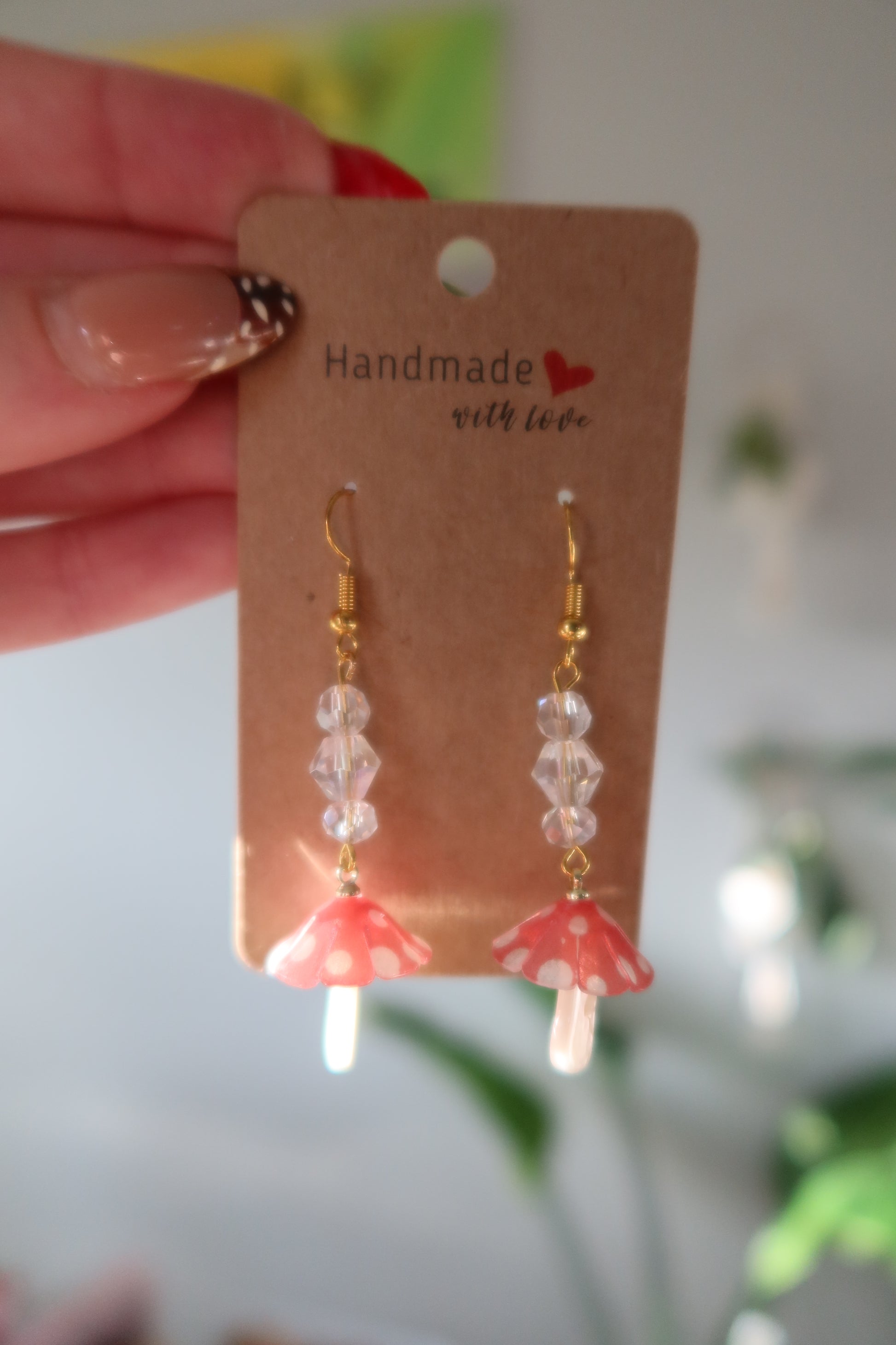 These statement earrings feature red resin mushroom charms with white polka dots, paired with iridescent crystal-like beads for a little sparkle in the sun. Hung on gold-tone hooks, they bring playful magic to any outfit — from garden walks to dance floors.