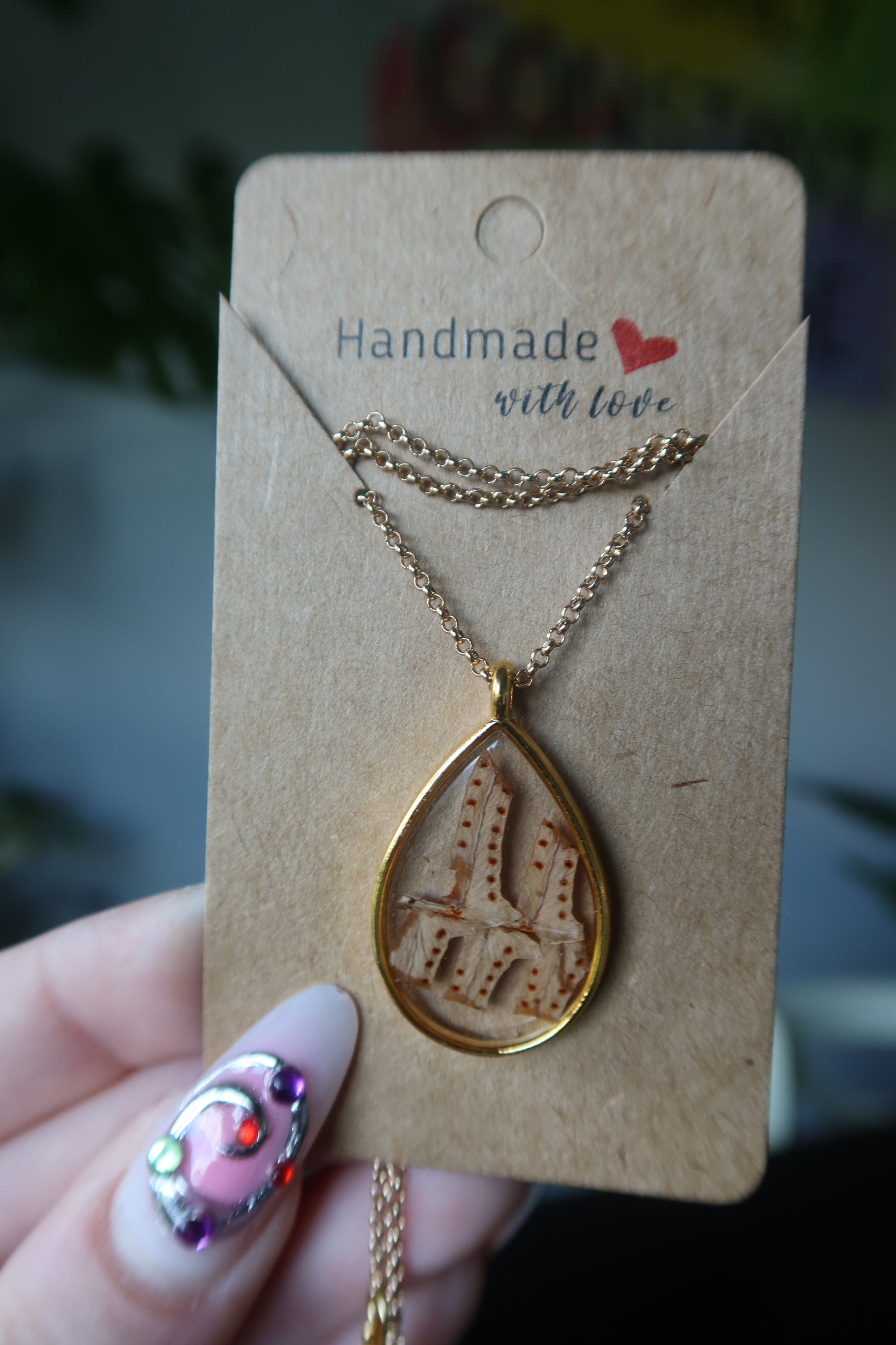 Delicate, transparent, and a little bit magical — this necklace features real fern leaves encased in resin and framed in gold.