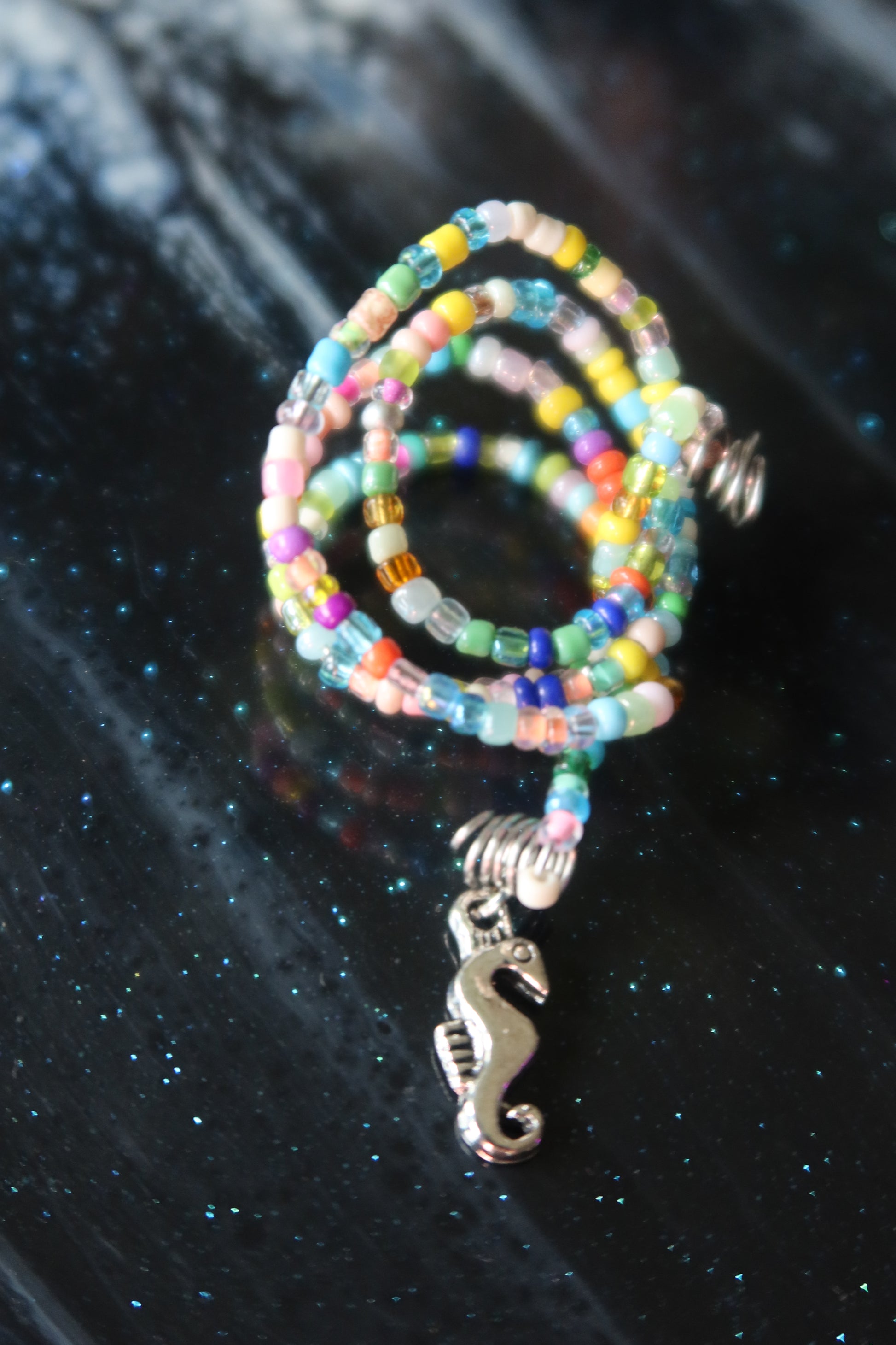 Material: Stainless steel wire and seed beads in shades of blue, green, and other vibrant ocean hues.
