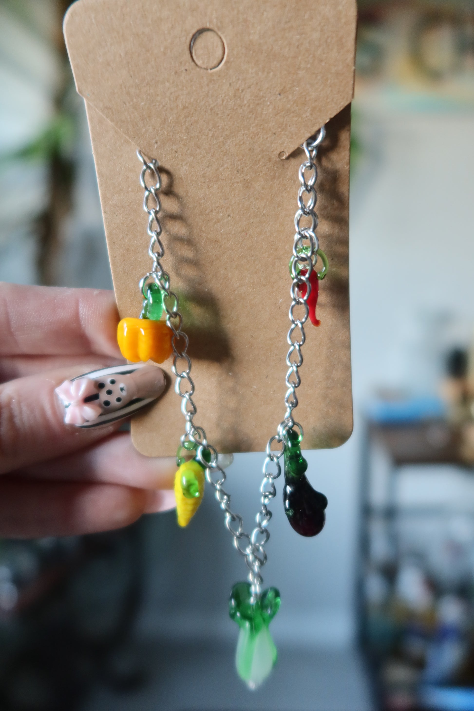 A little garden magic for your wrist. This handcrafted bracelet features detailed glass vegetable charms in rich, earthy colors that capture the beauty of the harvest season. Each gold stainless steel chain is accented with one of each veggie charm including lettuce, chili peppers, eggplants, corn, and pumpkins. The mix of vibrant tones and handmade texture adds playful charm to any outfit while keeping your love for plants close at hand.
