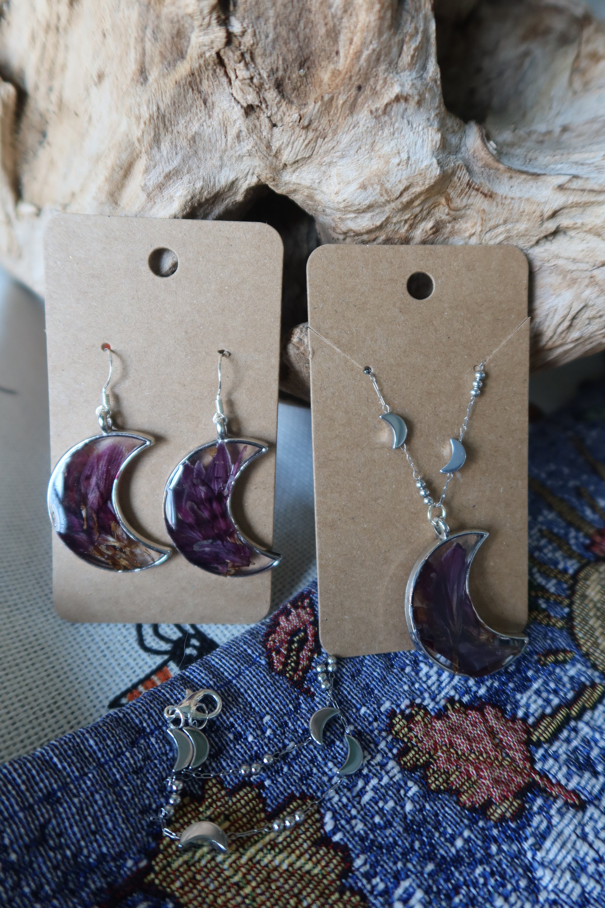 Featuring a real purple chrysanthemum bloom, carefully pressed and preserved in durable resin, this piece captures the soft, celestial glow of moonlight. Suspended from a 16-inch silver stainless steel moon chain, it’s a dreamy and timeless way to celebrate the magic of nature and femininity.